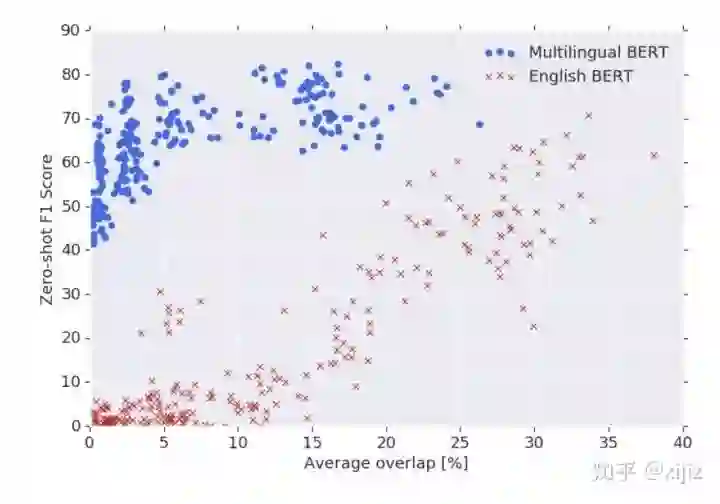 如图3-2,该示意图是零样本NER迁移学习F1分数与16种语言重叠实验的对比结果,包含了多语言BERT和英文BERT。我们可以看到英文BERT的性能表现非常依赖于词汇重叠,迁移学习的能力会随着重叠率的下降而逐渐下降,甚至在完全不同的语言文本中(即重叠率为0)出现F1分数为0的情况。但是多语言BERT则在大范围重叠率上表现得非常平缓,即使是不同的语言文本,这证明多语言BERT在某种程度上拥有超过浅层词汇级别的深层次表征能力。