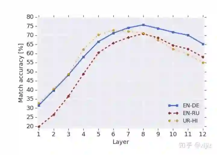 作者还设计了一个实验探索多语言BERT在特征空间上的多语言表征。作者首先从数据集WMT16中采样了5000个句子对,将句子分别输入到没有经过微调的多语言BERT。然后抽取每个句子在BERT每一层的隐藏特征向量(除开[CLS]与[SEP])并取平均,得到一个表示 。我们计算从一种语言到另一种语言的向量表示: ,这里M是句子对数量。当我们翻译每个句子 时,我们通过 寻找最近的德语句子向量,最近的邻居便是正确的句子对,我们称之为最近邻准确度(nearest neighbour accuracy)。