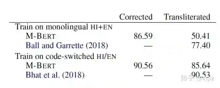 为了探索多语言BERT在多语言文本混合(Code-switching)和音译(transliteration)的情况下表征能力如何,作者进一步在UD语料库上测试了印地语(HI)和英语(EN)。多语言文本混合是指一个表达里面参杂多种语言,而音译则指将发音相似的外来词语直接通过读音翻译过来,比如酷 (cool)和迪斯科(disco)等。