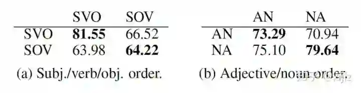 语言的顺序类型特征一般包括这两种,主谓宾(subject/verb/object, SVO)顺序或者形容词名词(adjective/noun, AN)顺序。图3-5展示了在POS任务上进行的跨语言迁移学习的宏平均准确率与语言类型特征的对比。我们可以看到性能表现最好的情况是语言类型特征一样(SVO和SVO,SOV和SOV,AN和AN以及NA和NA)的迁移学习,这表明虽然多语言BERT能够学习到一定的多语言表征,但是似乎没有学习到这些语言类型结构的系统转换去适应带有不同语言顺序的目标语言。