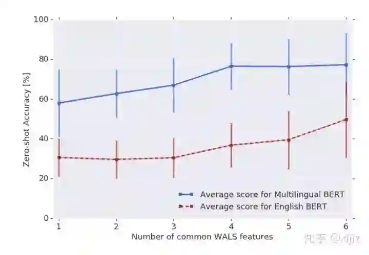 WALS是与语法结构相关的特征,图3-4展示了多语言BERT在零样本迁移学习上POS任务的准确率与WALS特征数量的对比图。我们可以看到,准确率会随着语言相似度的提升而提升,这证明多语言BERT对具有相似特征的语言的迁移学习更加友好。