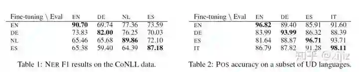 本文尝试着回答这些问题,作者基于Devlin et al发布的用104种语言组成的单一语料库训练的单个多语言BERT模型,在上面做了一系列实验,最终结果显示多语言BERT在跨语言的零样本迁移学习上表现得非常好。作者设计了一些标注任务,这些任务在一种语言上对该任务进行微调,最后再在另一种语言上进行评估。
