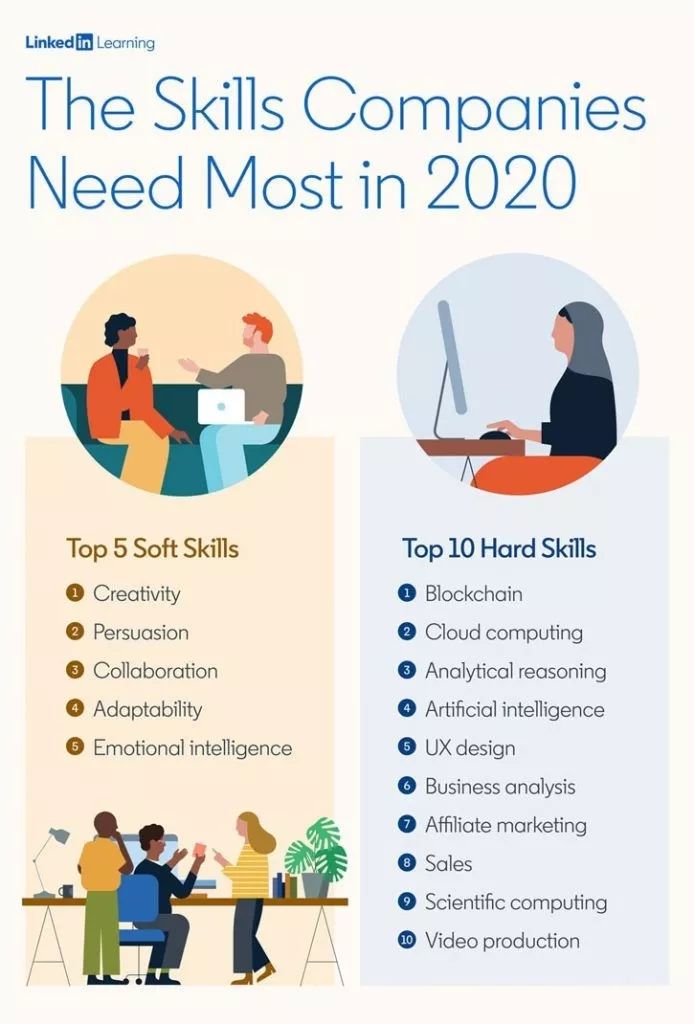 面向就业的社交平台 LinkedIn 最新数据显示,区块链是 2020 年最受欢迎的硬技能。这些技能排名是相对于他们的供应需求来说的。衡量需求的方法是,从职业简介列出的各项技能中,识别出那些聘用率高的人所具备的技能。技能分为两组:硬技能包括处理特定任务的专业知识和技术能力,而软技能更多的是关于行为和思维、个人特质和认知技能。