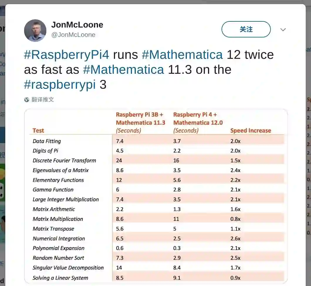 测试结果是 Raspberry Pi 4 上运行 Mathematica 12 的速度是 Raspberry Pi 3 上运行 Mathematica 11.3 的 2 倍。