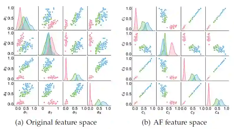 图 3 Iris 数据集在原始空间和 AF 空间中的散点图与可分性