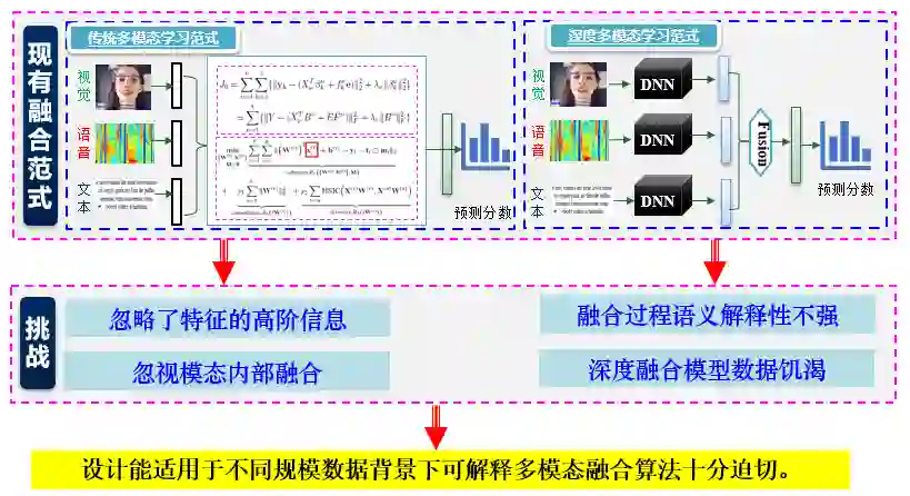 多模态数据是信息科学领域的常见数据形态,如何有效融合不同模态信息进行分析决策是该领域的重要科学问题。从学习范式来看,现有传统多模态学习范式往往忽视了特征间的关联关系信息和特征的高阶信息;深度多模态学习范式则面临数据饥渴、融合过程语义解释性不强问题。尽管面向多模态信息处理已取得了一些进步,但仍然面临着不同模态语义统一表示难、融合效果提升难等挑战(图1)。