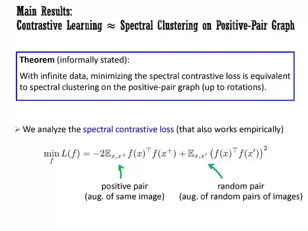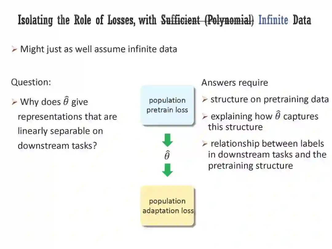 工智能正在经历范式转变,一些经过自监督预训练、然后适应广泛下游任务的模型正在兴起。然而,它们的工作原理在很大程度上仍然是个谜;经典的学习理论无法解释为什么对无监督任务的预训练可以帮助许多不同的下游任务。本次演讲将首先研究预训练损失在从未标记数据中提取有意义的结构信息方面的作用,特别是在无限数据状态下。具体来说,我将展示对比损失可能产生的嵌入,其欧氏距离捕获了原始数据之间的流形距离(或者更一般地说,所谓的正对图的图距离)。此外,嵌入空间中的方向对应于正对图中簇之间的关系。然后,我将讨论对实际预训练模型的行为进行清晰解释所必需的另外两个元素:体系结构的归纳偏差和优化器的隐式偏差。我将介绍两个最近正在进行的项目,其中我们(1)通过纳入体系结构的归纳偏差来加强之前的理论框架,(2)从经验和理论上证明优化器在预训练中的隐式偏差,即使使用无限的预训练数据。