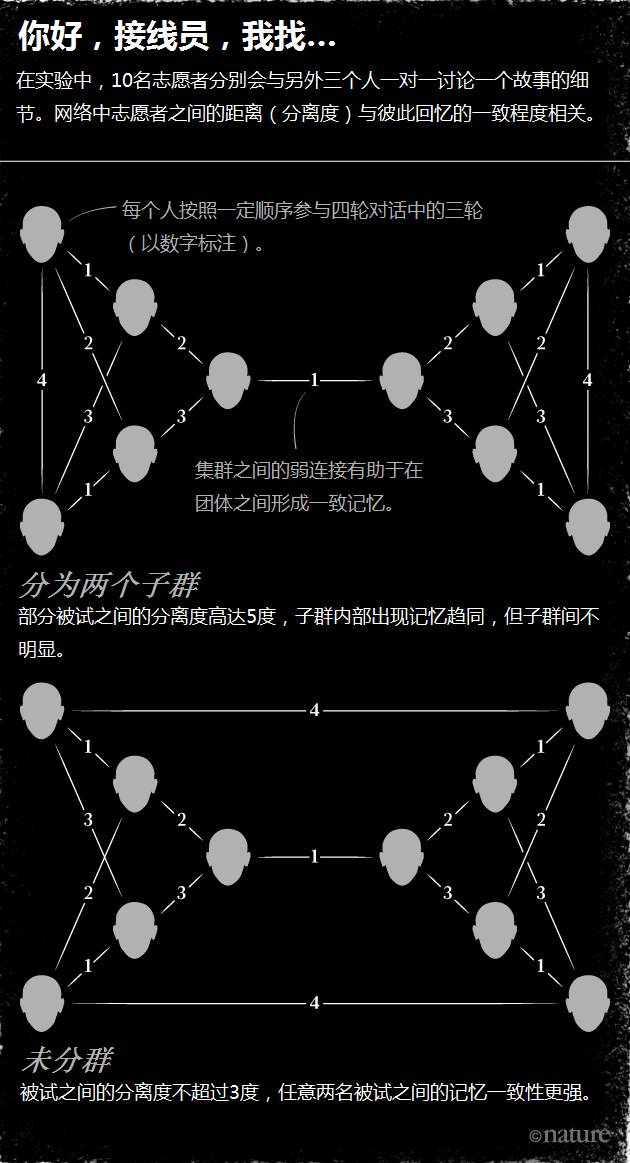 研究人员研究了两种场景:在第一种场景下,10人小组被分成了两个子集群,几乎所有对话都在子集群内部进行;在第二种场景下,10人小组本身组成了一个大集群(参见“你好,接线员,我找……”)。Coman表示,虽然单集群中的被试者就同一套信息达成了一致,但在第一种场景下,两个子群往往会分别就有关这些虚构志愿者的不同“事实”达成共识。
