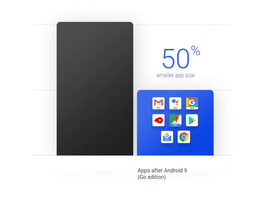 作为提供手机系统软件的一方,谷歌提出了一个新计划,对安卓进行精简使其在低性能设备上同样拥有流畅体验。我们见到了 Android Go,包括谷歌移动服务在内的应用都大幅瘦身,在保证核心功能完整的前提下缩小了 50% 体积,让可用存储空间相比过去多了一倍。