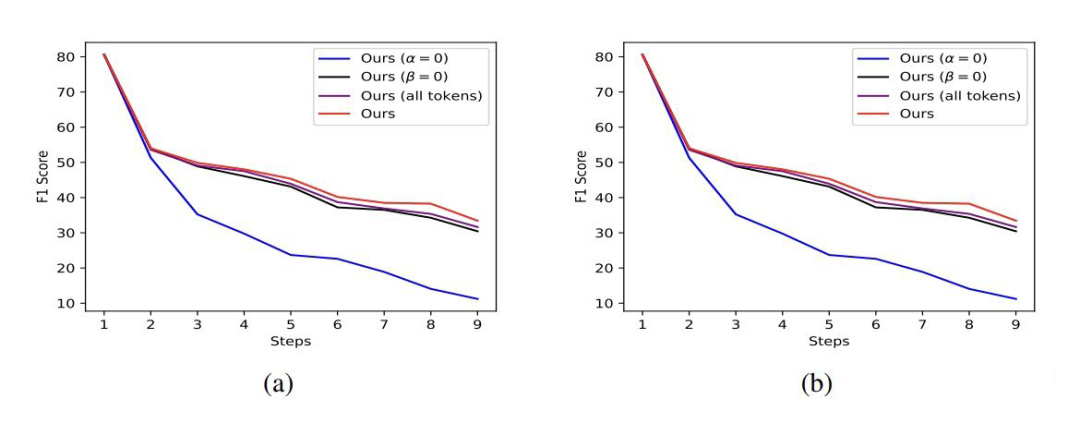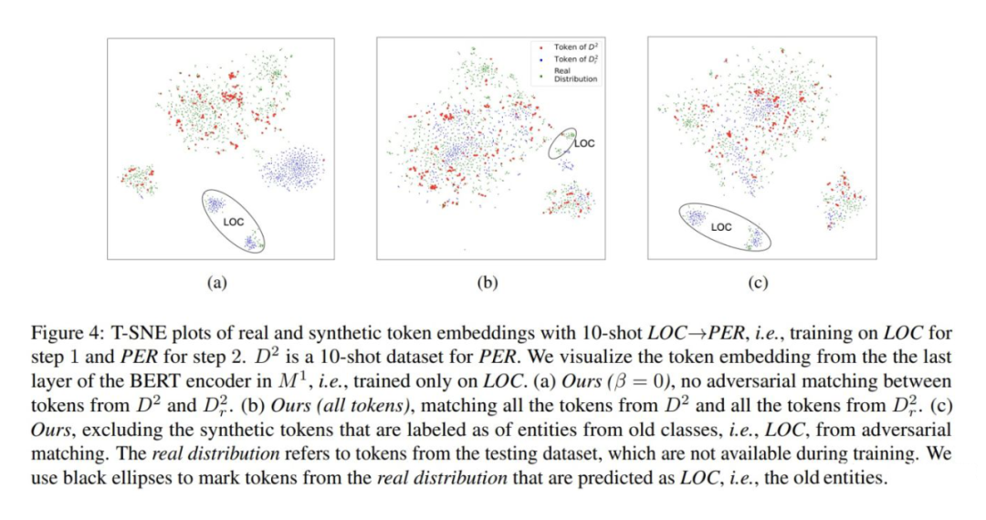 (b)中合成数据匹配真实数据分布,但是只有很少一部分合成数据与 LOC 标签的 token 相近,这是由于上文所说 D2 中并不存在 LOC 标签,将合成数据所有 token 与 D2 数据匹配会导致偏离 LOC 标签,丢失很多旧标签的信息。(c)中作者采用的方法合成数据中很多 token 与 LOC 接近,且其余 token 也与真实数据分布相匹配。
