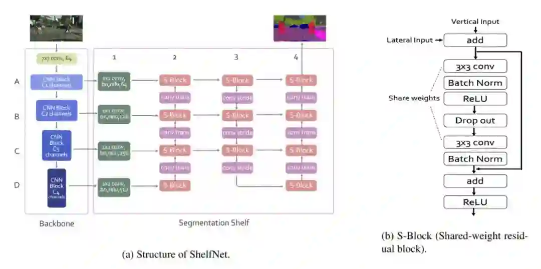 如上所述,ShelfNet使用ResNet主干,结合编码器/解码器分支。第一个编码器将信道复杂度降低了4倍,以加快推理速度。S块是具有权重的残差块,可显着减少参数数量。该网络使用跨步卷积进行下采样,并使用转置卷积进行上采样。该结构可以看作是FCN的集合,其中信息流经许多不同的路径,从而提高了准确性。