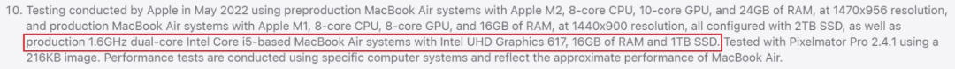 NBC 发现,苹果选取的是 2019 款 MacBook Air,CPU 为 14nm 的双核酷睿 i5-8210Y,基础频率只有 1.6GHz。GPU 则是英特尔 UHD Graphics 617。与这颗处理器相比,M2 采用的则是 5nm 制程工艺,具有 8 个 CPU 核心和多达 10 个 GPU 核心。