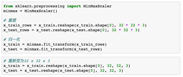 首先将训练数据集重塑为[50000, 3072]的形状,利用minmax来进行归一化。最后再将图像重塑回原来的形状。