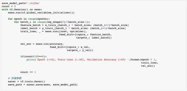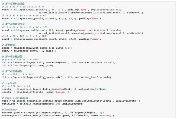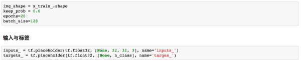 img_shape是整个训练集的形状,为[40000, 32, 32, 3],同时我们的输入形状是[batch_size, 32, 32, 3],由于前面我们已经对标签进行了one-hot编码,因此标签是一个[batch_size, 10]的tensor。