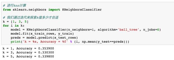 到此为止,我们已经对数据进行了预处理,下面就可以调用KNN来进行训练,我分别采用了K=1,3,5来看模型的效果。