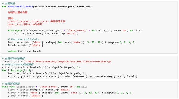 数据是被序列化以后存储的,因此我们需要使用Python中的pickle包将它们读进来。整个压缩包解压以后,会有5个data_batch和1个test_batch。我们首先把数据加载进来: