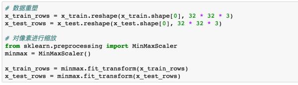 构造好了我们的x_train, y_train, x_test以及y_test以后,我们就可以开始建模过程。在将图片扔进模型之前,我们首先要对数据进行预处理,包括重塑和归一化两步,首先将32 x 32 x 3转化为一个3072维的向量,再对数据进行归一化,归一化的目的在于计算距离时保证各个维度的量纲一致。