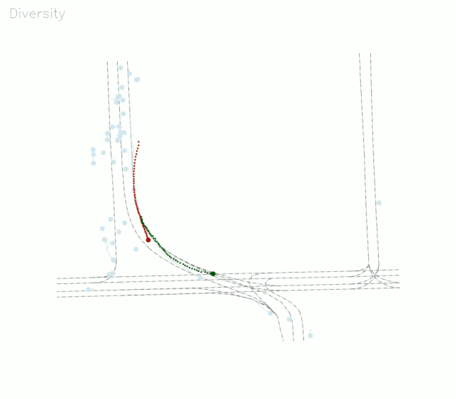 大家可以看到互动车辆的运动轨迹在不断变化,这个变化是由于我们借助生成模型在互动车辆的运动行为空间进行随机抽样而产生的。