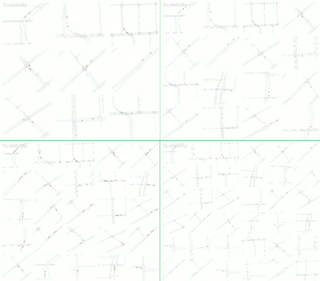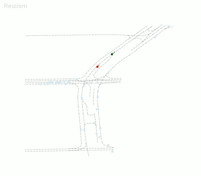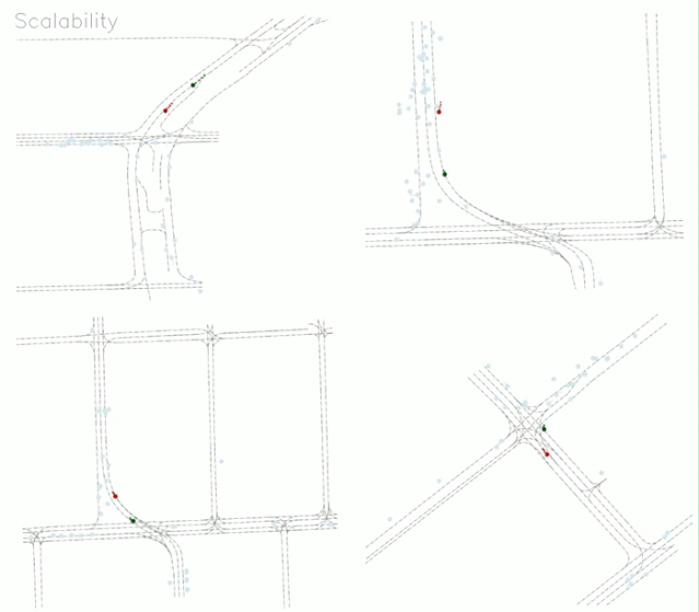 此外,以上动图也展示了仿真场景库的自动生成的相关工作。视频中红色和绿色的两个点,分别代表两辆车的运动轨迹,这些轨迹的生成和变化,是在真实的交通数据集上,利用深度学习的方法进行训练,再使用训练好的深度神经网络 (生成模型) 合成大规模的互动车辆的轨迹。