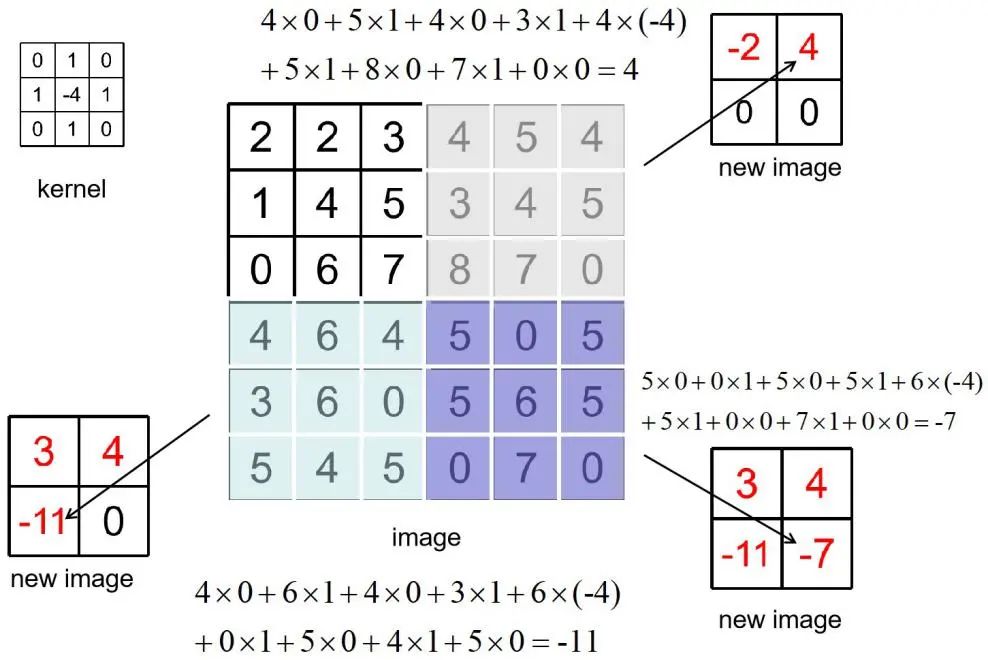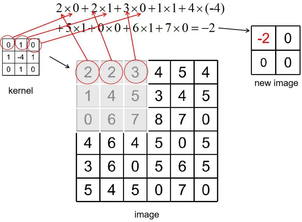 注意:图2.26中的new image出现负数,但实际图像中的像素值范围是在0~255,一般对于运算中出现的负数,都统一处理为0,为了让读者更好的理解卷积过程,这里省略了对负值的处理。