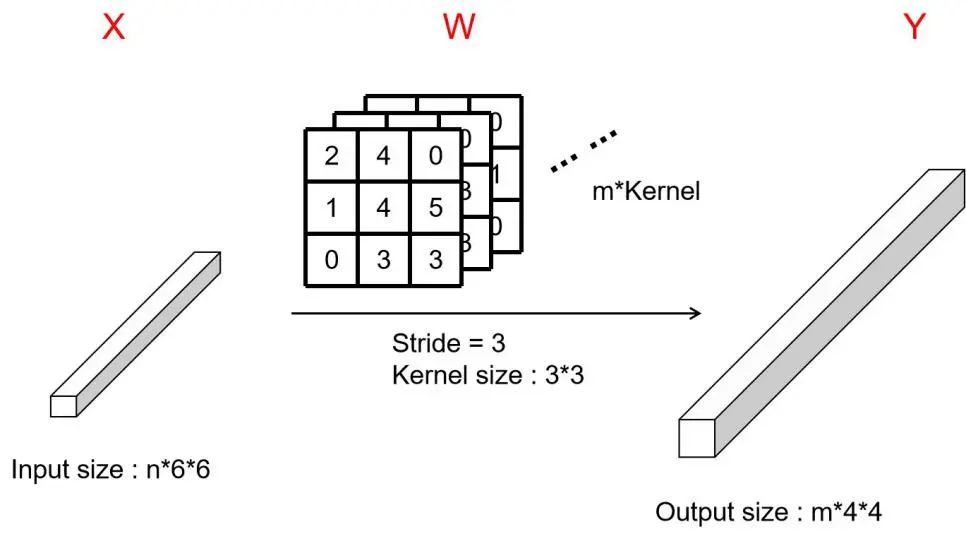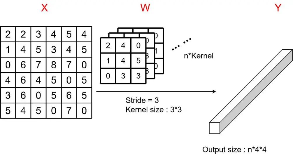 卷积层(Convolution layer)通常作为卷积神经网络的第一层,直接与输入相连接,如图2.29所示,我们可以简单地把卷积层的连接类比到多层神经网络不同层之间的连接,图中的X相当于多层神经网络的输入层;而卷积核的部分也就是W的部分,相当于多层神经网络的连接权值;最后的Y部分相当于多层神经网络的输出层。W部分中,卷积核的个数往往不会是1的,会是一个很大的数,这样可以通过多个不同的卷积核提取出X的多维特征,图2.29中一共有n个卷积核,步长为3,核尺寸为,每个卷积核会得到一个