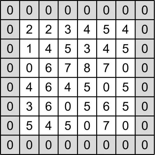由于在位数不足的时候,步长选择不合适就会发生图2.23所示的部分边界没有参与卷积操作的情况,而加边界正是用来解决这一问题。方法就是我们在图像周围添加像素,一般来说采用zero-padding即零填充,如图2.24所示,在图像周围添加一周灰度值为0的像素,这样在卷积操作进行的时候,就可以充分提取图像边缘的信息了。