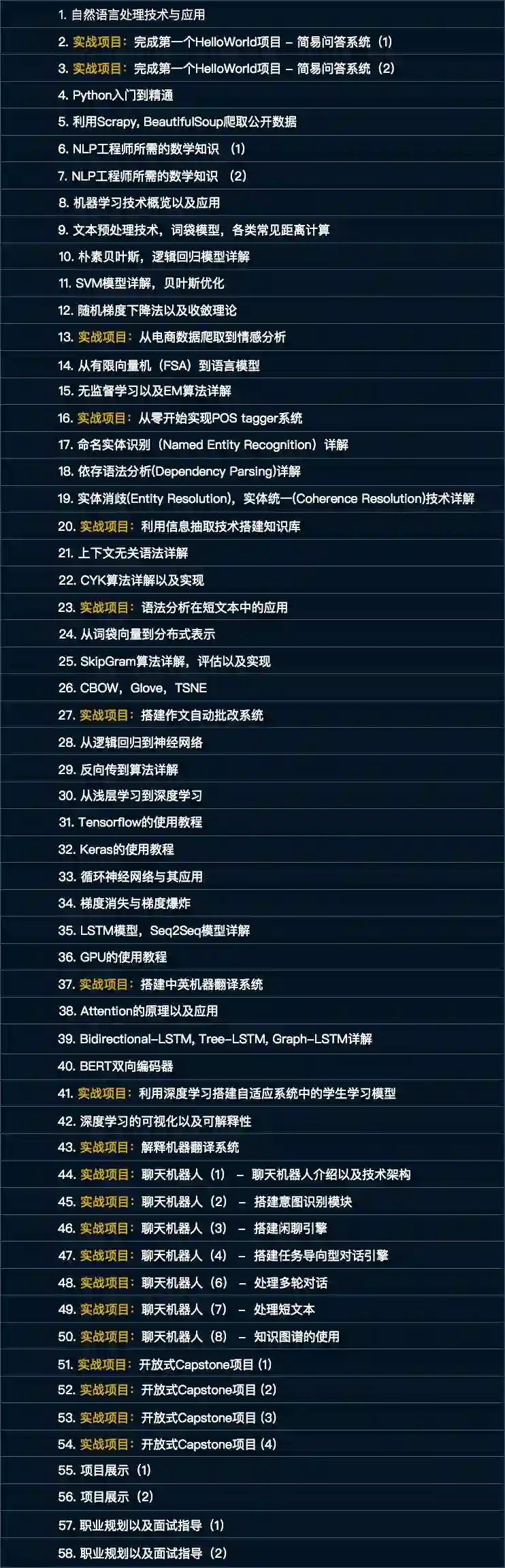 作为人工智能领域最为重要的技术,自然语言处理的应用在工业界无处不在。从网页公开数据的分析和抽取、情感分析、机器翻译、智能客服、问答系统到聊天机器人,它的重要性不言而喻。整个课程设计紧密围绕学术界最新进展以及工业界的需求,涵盖了能想到的所有核心知识点,并且结合了大量实战项目,培养学员的动手能力,解决问题能来以及对知识的深入理解。另外,课程的第二部分导师和助教团队会带领学员完成两个大项目,聊天机器人和Capstone项目。这些项目都可以成为你简历上的亮点。