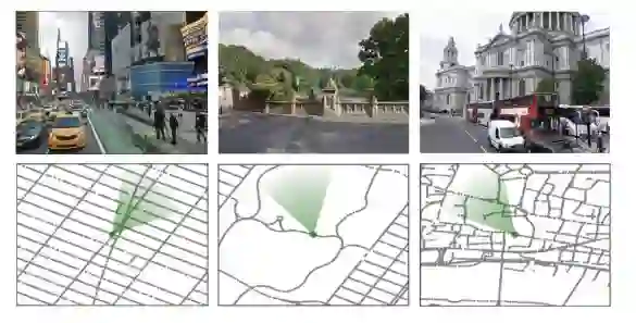 我们的环境根据StreetView的实际场所构建的。该图显示了纽约市(时代广场、中央公园)和伦敦(圣保罗大教堂)的不同景观和相应的局部地图。绿色圆锥表示智能体的位置和方向。
