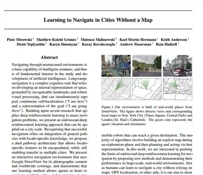 我们背离了那种依赖于显式测绘和探索的传统方法(就像试图将自己定位并同时绘制地图的那种制图师)。与此相反,我们的方法是学习人类过去常常使用的那种方法进行导航——没有地图、GPS定位或者其他的辅助手段,只使用视觉观察。我们构建了一个神经网络智能体,它输入从环境中观察到的图像,并预测在该环境中它应该采取的下一步行动。我们使用深度强化学习来对它进行端到端的训练,类似于最近的一些关于学习如何在复杂的3D迷宫中进行导航的研究,以及在玩游戏中使用引入了无监督辅助任务的强化学习的研究。与那些在小规模模拟迷宫环境中进行的研究不同,我们利用了城市规模的真实世界数据,包括复杂的十字路口、人行道、隧道,以及横跨伦敦、巴黎和纽约的各种拓扑结构。此外,我们使用的方法还支持特定城市的学习和优化,以及泛化的、可迁移的导航行为。