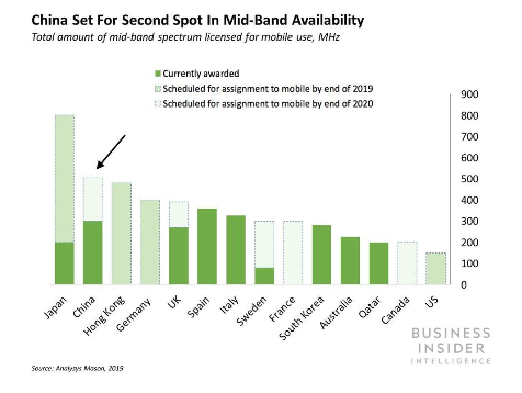 中频频谱。中国已经为运营商分配了300兆赫的中频频谱用于测试,仅次于西班牙和意大利,其频谱测试数量在各个国家中排名第三。预计到2020年底,中国将跃居第二位,届时中国将有大约500兆赫的中频频谱可供使用。