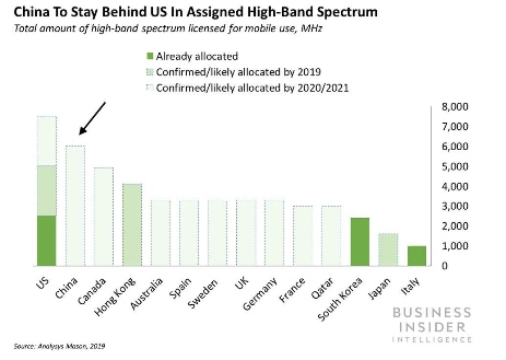预计到2020年或2021年,中国将在mmWave(毫米波)频段分配频谱,届时,中国可能将在商用移动服务的mmWave(毫米波)频谱数量方面接近领先国家美国。