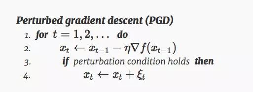 这里 xt 是需优化变量在第 t 步的值,η 是步长。梯度下降法的理论研究在凸优化上已经很充分了,但是在非凸优化情况下就少了很多。我们知道,在非凸情况下,GD 会快速收敛到驻点(附近的点),但是这些稳定的点可能是局部极小点或者是没用的局部最大点或者甚至是鞍点。