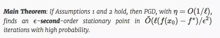 主要定理中,O~(⋅) 只隐藏了对数因子;这边对维度的依赖只有 log4(d).。定理证明,在一个额外增加的 Hessian-Lipschitz 条件下,增加扰动的 GD 收敛到二阶驻点的时间和 GD 收敛到一阶驻点的时间几乎是一样的。因此,我们可以得出结论,PGD 可以无消耗的逃离鞍点。