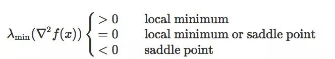 在这篇文章中,我们定义鞍点,既包括经典鞍点,也包括局部极大值。它们是沿着至少一个方向在局部最大化的驻点。鞍点和局部极小值可以根据 Hessian 的最小特征值来分类: