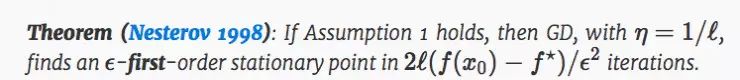 在这个定理中,x0 是初始点,f⋆ 是全局极小值的函数。定理规定任何 gradient-Lipschitz 函数,任何驻点都可以通过 GD 在第 O(1/ϵ2) 次获得,不受 d 的影响,这就是所谓的 “自由尺寸优化”。对一个 GD 的成本计算为 O(d),因此整体的运行时间为 O(d) 的阶。 O(d) 这样线性 scaling 对现代高维非凸问题(比如深度学习)来说是非常重要的。
