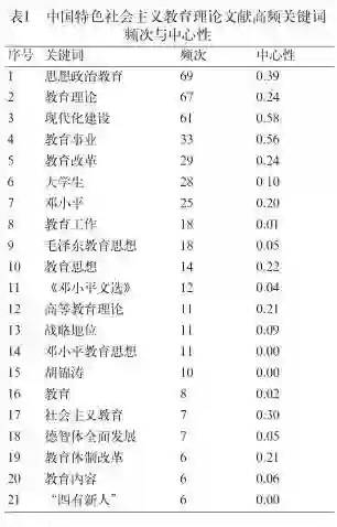 为了更好地说明高频关键词共现网络图谱,我们将Citespace中生成的关键词的词频、中心性数据导出,得到了中国特色社会主义教育理论文献高频关键词的词频与中心性数据表(见表1)。