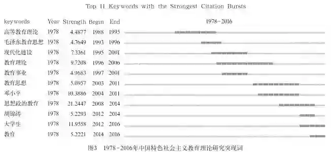 在Citespace生成的高频关键词共现网络图谱的基础上,运用Burstness功能,即可得到1978~2016年中国特色社会主义教育理论研究突现词,如图3所示。