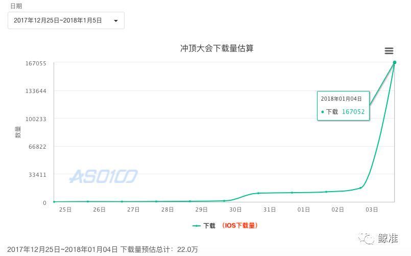 (1)从“冲顶大会”APP上线至今,不到半个月的时间里,已经在iOS和android端积累了超过100万的下载量——这大概是近2年来最快达到百万用户体量的APP了(见下图):
