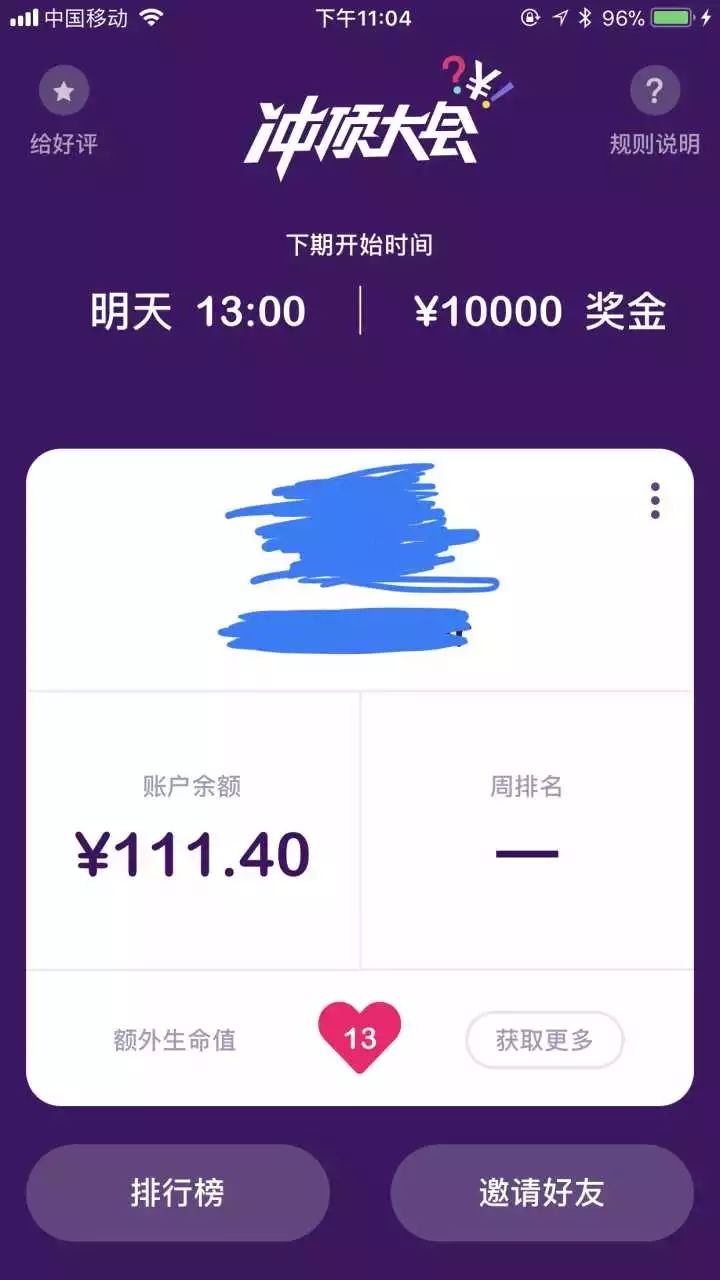 (4)每次“冲顶”,参与者都能够“复活”一次,获得“复活”机会需要依靠把“冲顶”分享给其他人来获得,每有一个人使用了你的邀请码加入游戏,你就多获得了一次复活机会;