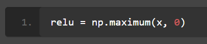 NumPy 就提供了有用、直观的语法,可用于构建 ReLU 函数。ReLU 激活函数(蓝色曲线)可以在代码中解释,如下所示,其中 x 是我们的输入,relu 是输出: