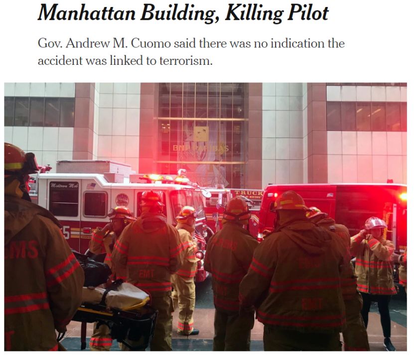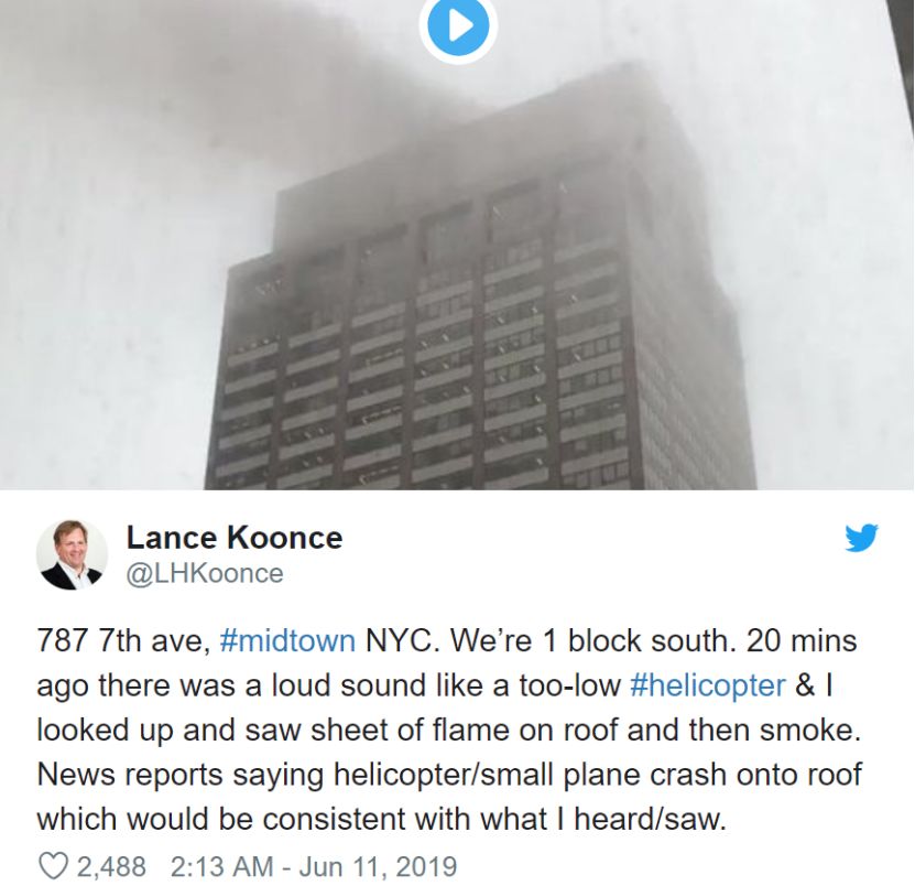 一位网友表示,“我们与出事的大楼只隔了一个街区。20分钟之前,我听到一个响亮的声音,就像一个飞的太低的直升机,我抬头看到屋顶上有火焰冒出,然后浓烟滚滚。新闻报道说直升机/小型飞机撞到屋顶上,这与我听到/看到的情况一致。”