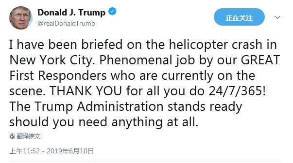白宫发言人霍根表示,特朗普已被告知这一事故,并表示他将严密关注此事动态。特朗普对此事发表推文称,“我已经听取了纽约市直升机坠毁事故的汇报。正在现场的伟大应急部门工作很出色。谢谢你们24/7/365的贡献!特朗普政府随时为你们服务。”