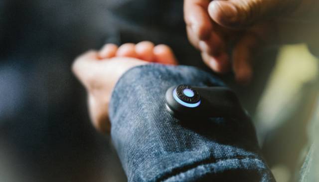 夹克的左袖扣位置连接了一个外置蓝牙模块。模块有震动的功能,可以拔下来用 USB 充电。