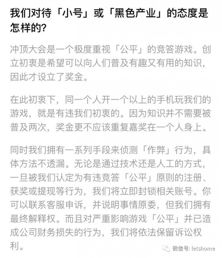 但“冲顶大会”的规则说明中针对“小号”或“黑色产业”明确表示,“无论是通过技术还是人工的方式,一旦被我们认定为有违竞答公平原则的注册、获奖或提现等行为,我们将立即封锁相关账号。你可以联系客服申诉,并说明事情原委,但我们拥有最终解释权。”
