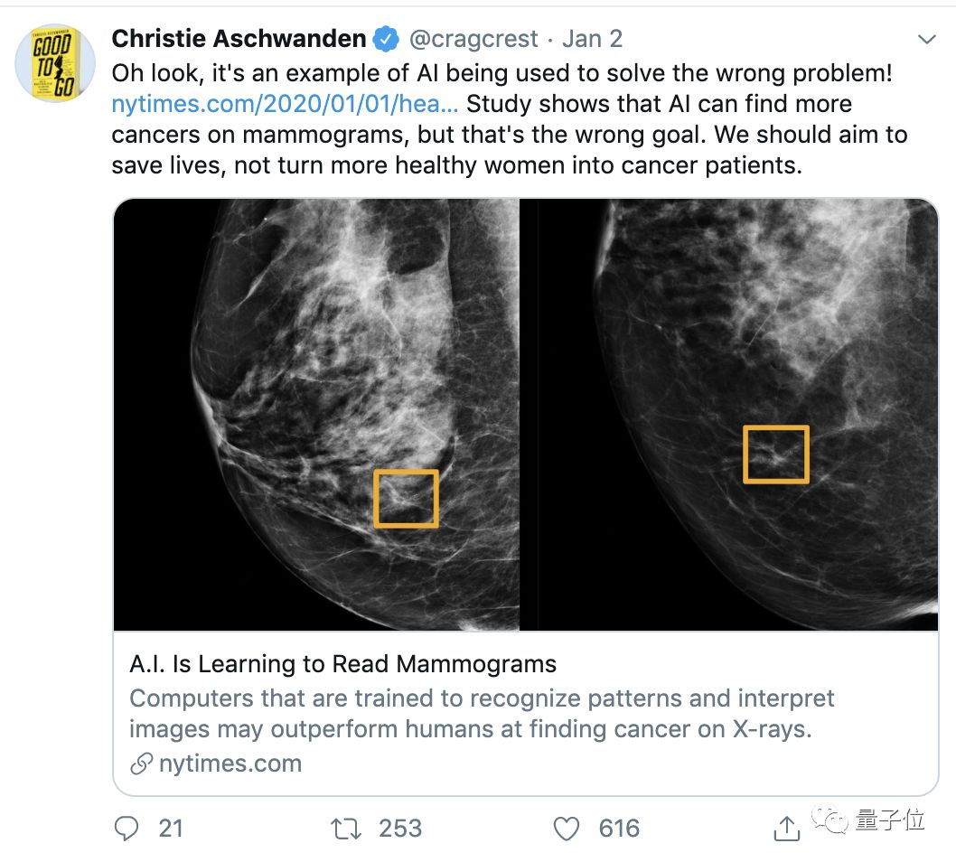 美国的知名科学记者、《纽约时报》撰稿人Christie Aschwanden认为,虽然AI擅长检测出被忽视的变量,但如果这些变量是良性肿瘤,对于治疗毫无帮助,还可能导致身体危害。