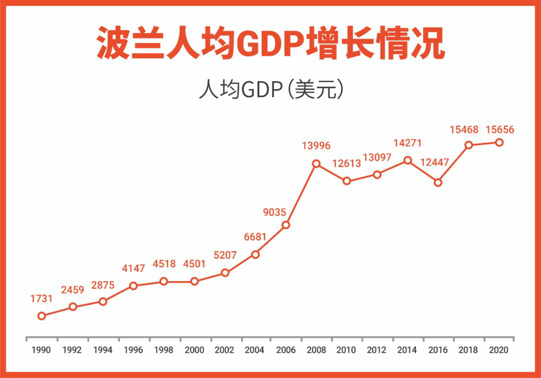 以人均GDP计算,1990年波兰世界排名88位,大大落后俄罗斯的61位。2020年,波兰的人均GDP达到15,656美元,位居49,中国和俄罗斯分别为63和65。有机构预测,2022年波兰人均GDP有望挑战17,000美元,