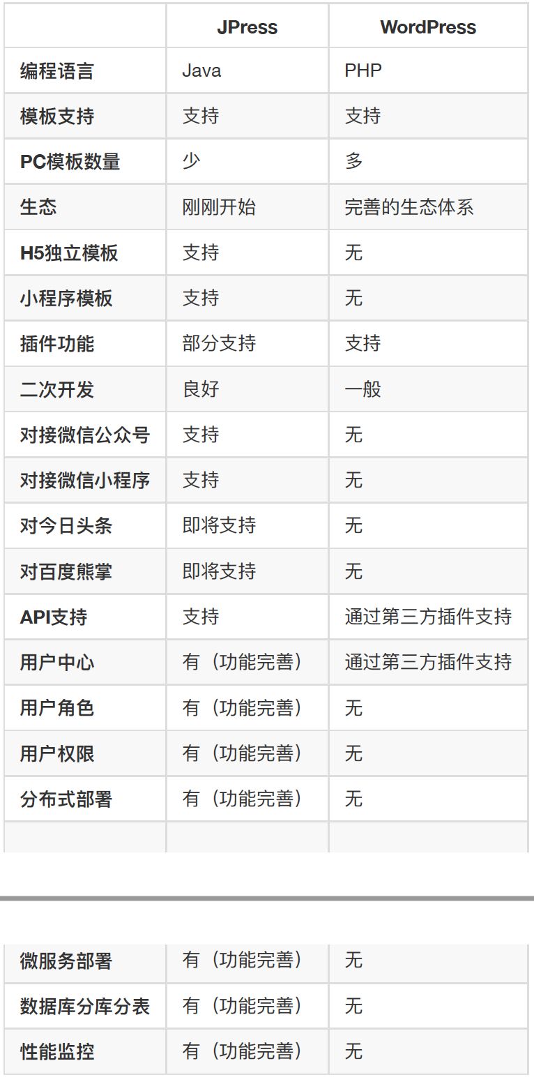 JPress 和 WordPress 的差别,其实还有更多的地方,以上表格做了部分对比。