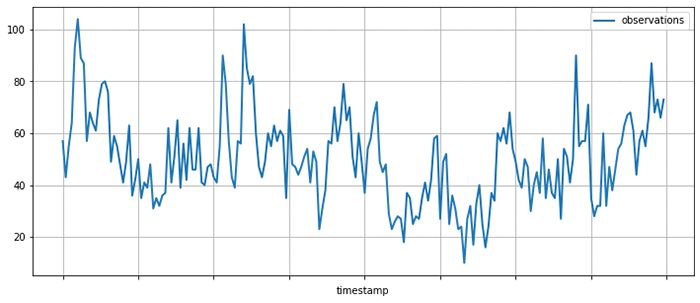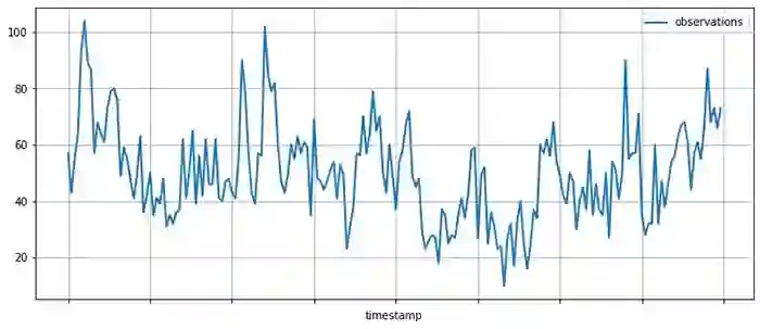 顾名思义,时间序列即按时间排列的数据的集合。时间序列自然存在于各种场景中,常由在一个固定时间段中测量某些过程而得到。比如说,零售商在每个营业日结束时会计算并记录这一天售出了多少商品。对于单个商品而言,这样的记录就是一个每日销量的时间序列。抑或是电力公司测量每个家庭在某一个时段(例如每小时)的用电量,这样就得到了电力消耗的一个时间序列。还有,亚马逊云服务的用户会使用 Amazon CloudWatch 来记录资源和服务的各项指标,这样会产生各种指标的时间序列。一个典型的时间序列如下所示,纵轴显示测量得到的值,横轴显示时间: