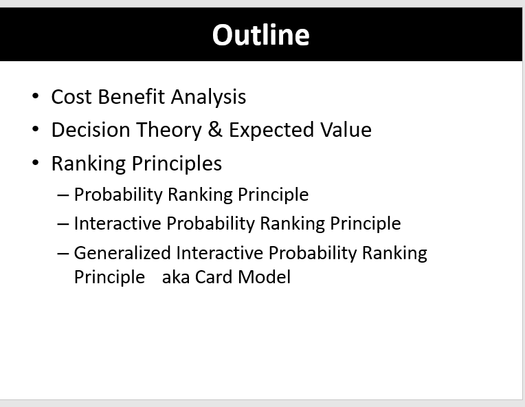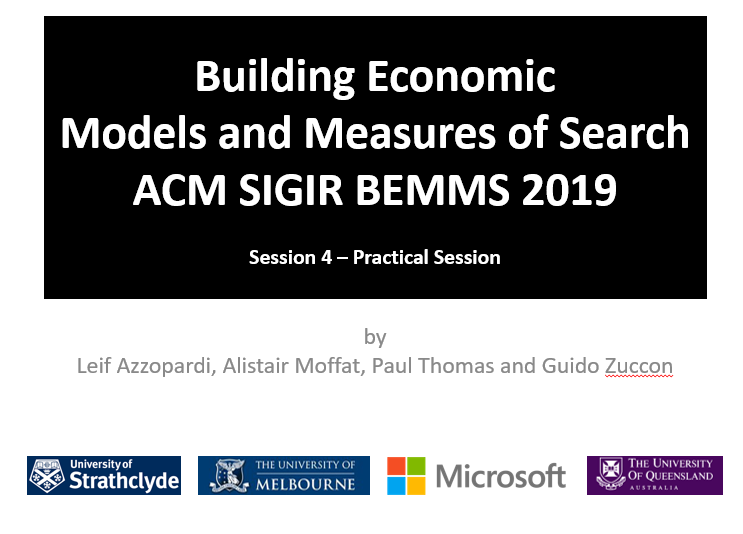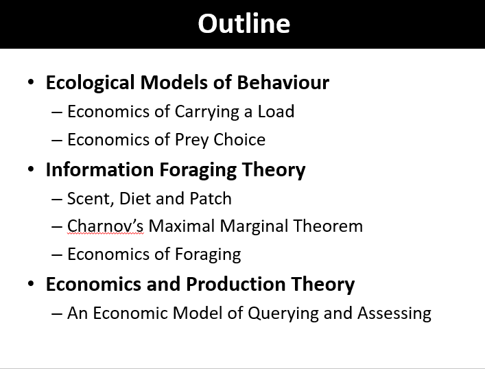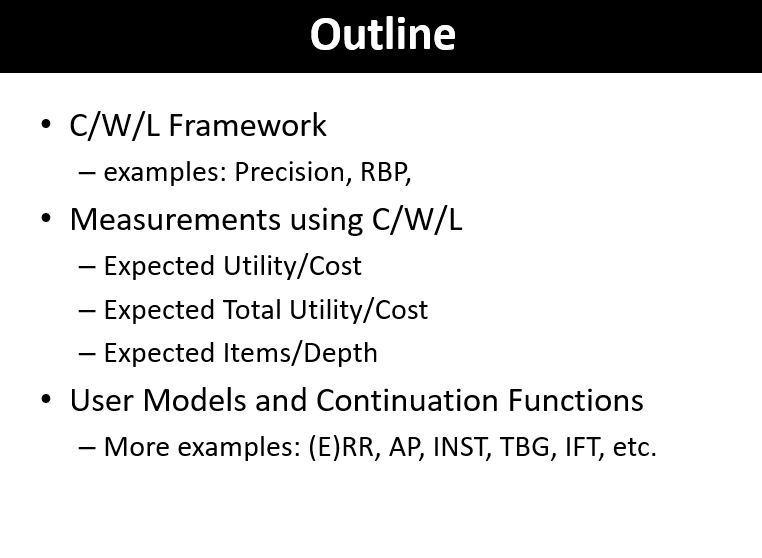 在本课程中,我们将首先概述相关的经济理论,例如信息觅食理论和搜索中的微观经济学。接下来将展示如何使用经济学模型来模拟用户与搜索系统的交互,以生成关于行为和性能的假设,这些假设可以为实验提供相关信息。第三部分,将重点介绍如何利用经济学,来为信息检索系统提供CWL框架支持。然后,将展示如何使用信息觅食理论,来衡量信息检索系统的性能 (将人们搜索的理论,与我们如何衡量它的理论联系起来)。