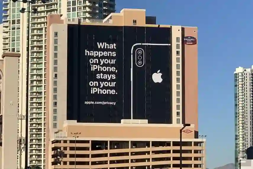 在2019年CES,科技公司如Facebook正因泄露用户数据成为众矢之的时,苹果则在不远处挂起广告: